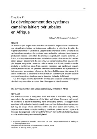 Résumé (autre langue) : The dromedary camel is being used more and more in intensified dairy systems, especially in the peri-urban areas of the Sahel and Sahara. The camel milk supply for the towns is based on sedentary herds of lactating camels. The supply chains associated with peri-urban herds is usually short and directly limited to the consumer, but may be longer where collection centres and small dairies are involved. The paper represents three examples: the highly subsidized systems around Laâyoune in Morocco; the organised sector around the “Tivisky” dairy in Nouakchott, Mauritania; and the smallholder systems around Djibouti. The recent developments need to be studied in detail as they reveal changes in farming systems, which have important implications in the development of the milk sub-sector.