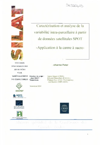 Pater Johanna. 2004. Caractérisation et analyse de la variabilité intra-parcellaire à partir de données satellitales SPOT. Application à la canne à sucre. Montpellier : ENGREF, 44 p. Mémoire de master : Ecole nationale du génie rural, des eaux et des forêts