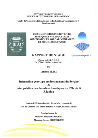 Tlili Anissa. 2005. Interaction génotype environnement du sorgho et interpolation des données climatiques sur l'île de la Réunion. Montpellier : UM2, 43 p. Mémoire DESS : Méthodes statistiques appliquées aux industries agronomiques agroalimentaires et pharmaceutiques : Université Montpellier 2