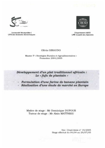 Giraudo Olivia. 2005. Développement d'un plant traditionnel africain : le fufu de plantain. Formulation d'une farine de banane plantain, réalisation d'une étude de marché en Europe. Montpellier : UM1, 104 p. Mémoire de master : Stratégies rurales et agroalimentaires : Université Montpellier 1