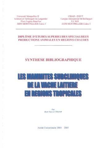 Le Thanh Bich Van. 2005. Les mammites subcliniques de la vache laitière en régions tropicales. Montpellier : UM2, 35 p. Mémoire DESS (Synthèse bibliographique) : Productions animales en régions chaudes : Université Montpellier 2