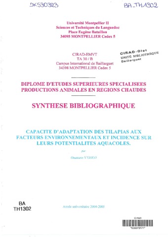 N'Golo Ouattara. 2005. Capacité d'adaptation des tilapias aux facteurs environnementaux et incidence sur leurs potentialités aquacoles. Montpellier : UM2, 30 p. Mémoire DESS (Synthèse bibliographique) : Productions animales en régions chaudes : Université Montpellier 2