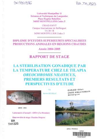 Michelat Marion. 2005. La stérilisation gonadique par la température chez le tilapia Oreochromis niloticus, premiers résultats et perspectives d'étude. Montpellier : UM2, 62 p. Mémoire DESS : Productions animales en régions chaudes : Université Montpellier 2