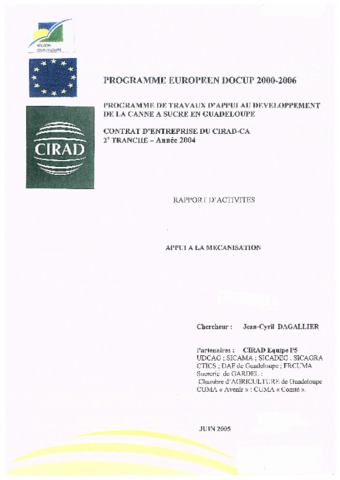 Dagallier Jean-Cyril. 2005. Appui à la mécanisation : Programme européen DOCUP 2000-2006. Contrat d'entreprise du Cirad-Ca - 2ème tranche - Année 2004. Programme de travaux d'appui au développement de la canne à sucre en Guadeloupe. Montpellier : CIRAD-CA, 12 p.