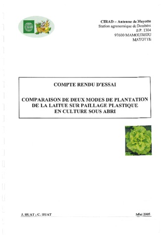 Huat Joël, Huat Catherine. 2005. Comparaison de deux modes de plantation de la laitue sur paillage plastique en culture sous abri : compte rendu d'essai. Montpellier : CIRAD-FLHOR, 9 p.