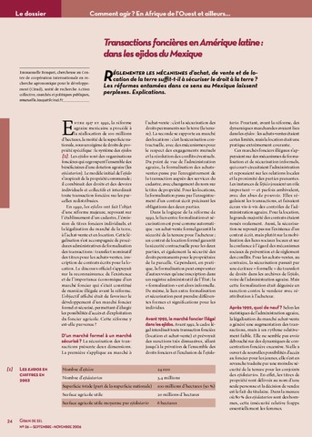 Résumé : RÉGLEMENTER LES MÉCANISMES d'achat, de vente et de location de la terre suffit-t'il à sécuriser le droit à la terne Les réformes entamées dans ce sens au Mexique laissent perplexes. Explications.