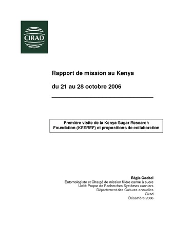 Goebel François-Régis. 2006. Première visite de la Kenya Sugar Research Foundation (KESREF) et propositions de collaboration : rapport de mission au Kenya du 21 au 28 octobre 2006. Montpellier : CIRAD-CA, 14 p.