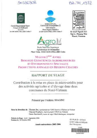 Biagini Frédéric. 2006. Contribution à la mise en place de micro-crédits pour des activités agricoles et élevage dans deux communes du Nord-Vietnam. Montpellier : UM2, 131 p. Mémoire de master 2 : Biologie géosciences agroressources et environnement. Productions animales en régions chaudes : Université Montpellier 2