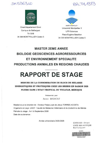 Brincat Anne. 2006. Mesure de la consomation de blocs de mélasse énergétiques et proteiques chez les brebis en saison des pluies dans l'état tropical du Yucatan, Méxique. Montpellier : UM2, 40 p. Mémoire de master 2 : Biologie géosciences agroressources et environnement. Productions animales en régions chaudes : Université Montpellier 2