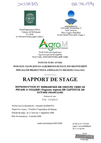 Coueron Eve. 2006. Reproduction et hiérarchie de groupe chez le pécari à collier (Tayassu tajacu) en captivité en Guyane Française. Montpellier : UM2, 60 p. Mémoire de master 2 : Biologie géosciences agroressources et environnement. Productions animales en régions chaudes : Université Montpellier 2