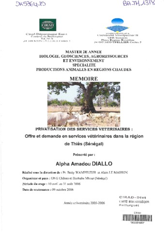 Diallo Alpha Amadou. 2006. Privatisation des services vétérinaires : offre et demande en services vétérinaires dans la région du Thiès (Sénégal). Montpellier : UM2, 69 p. Mémoire de master 2 : Biologie géosciences agroressources et environnement. Productions animales en régions chaudes : Université Montpellier 2