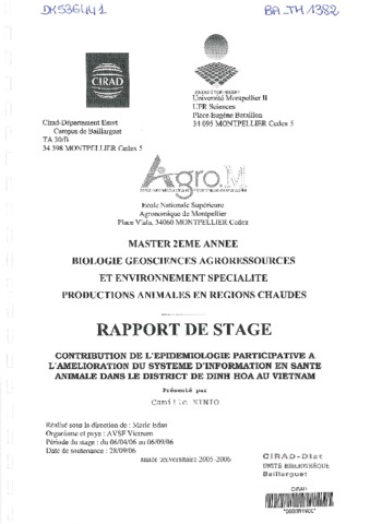 Ninio Camille. 2006. Contribution de l'épidémiologie participative à l'amélioration du système d'information en santé animale dans le district de Dinh Hoa au Vietnam. Montpellier : UM2, 89 p. Mémoire de master 2 : Biologie géosciences agroressources et environnement. Productions animales en régions chaudes : Université Montpellier 2