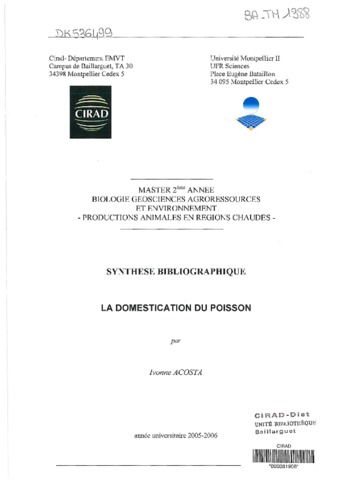 Acosta Ivonne. 2006. La domestication du poisson. Montpellier : UM2, 40 p. Mémoire de master 2 (Synthèse bibliographique) : Biologie géoscience agroressources et environnement. Productions animales en régions chaudes : Université Montpellier 2