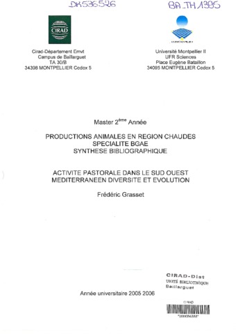Grasset Frédéric. 2006. Activité pastorale dans le sud ouest méditerranéen diveristé et évolution. Montpellier : UM2, 28 p. Mémoire de master 2 (Synthèse bibliographique) : Biologie géoscience agroressources et environnement. Productions animales en régions chaudes : Université Montpellier 2