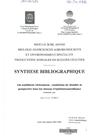Ninio Camille. 2006. Les auxiliaires vétérinaires : conditions de réussite et perspective dans les réseaux d'épidémiosurveillance. Montpellier : UM2, 31 p. Mémoire de master 2 (Synthèse bibliographique) : Biologie géoscience agroressources et environnement. Productions animales en régions chaudes : Université Montpellier 2