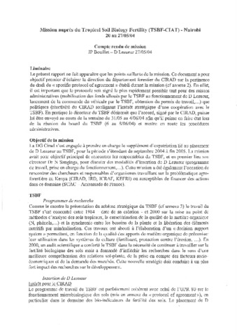 Bouillet Jean-Pierre, Lesueur Didier. 2004. Mission auprès du tropical soil biology fertility (TSBF-CIAT), Nairobi, 20 au 27/05/04. s.l. : s.n., 31 p.