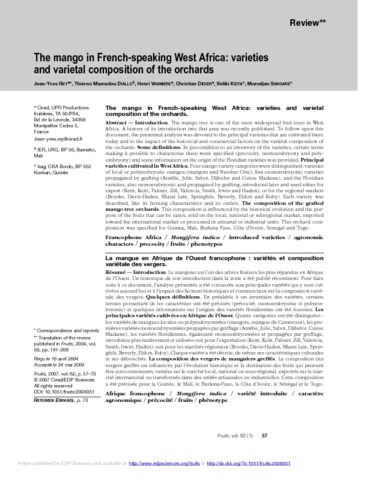Rey Jean-Yves, Diallo Thierno Mamadou, Vannière Henri, Didier Christian, Kéita Sidiki, Sangaré Morodjan. 2007. The mango in French-speaking West Africa : varieties and varietal composition of the orchards. Fruits, 62 (1) : 57-73.