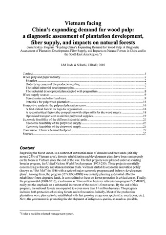Roda Jean-Marc, Rathi Santosh. 2005. Vietnam facing China's expanding demand for wood pulp : a diagnostic assessment of plantation development, fiber supply, and impacts on natural forests. Montpellier : CIRAD, 29 p.
