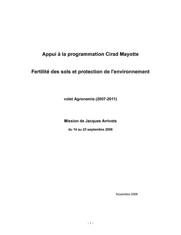 Arrivets Jacques. 2006. Appui à la programmation CIRAD Mayotte, fertilité des sols et protection de l'environnement : volet agronomie (2007-2011). Mission du 14 au 23 septembre 2006. s.l. : s.n., 20 p.