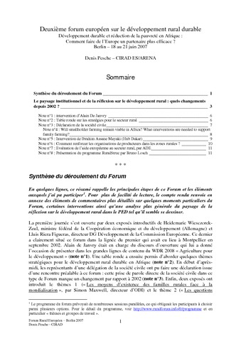 Pesche Denis. 2007. Synthèse sur le Deuxième Forum européen sur le développement rural durable. Développement durable et réduction de la pauvreté en Afrique : comment faire de l'Europe un partenaire plus efficace ? Berlin, 18 au 21 juin 2007. Montpellier : CIRAD, 12 p. Forum Européen sur le Développement Rural Durable. 2, Berlin, Allemagne, 18 Juin 2007/21 Juin 2007.