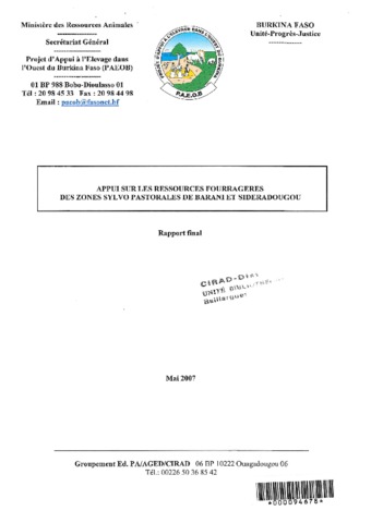 Rippstein Georges. 2007. Appui sur les ressources fourragères des zones sylvo pastorales de Barani et Sideradougou : rapport final. Montpellier : CIRAD, 43 p.