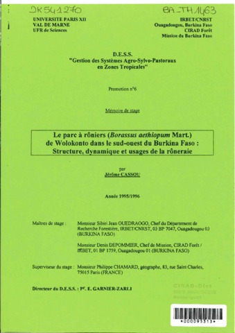 Cassou Jérôme. 1996. Le parc à rôniers (Borassus aethiopum Mart.) de Wolokonto dans le sud-ouest du Burkina Faso : structure, dynamique et usages de la rôneraie. Créteil : Université de Paris-Val-de-Marne, 110 p. Mémoire DESS : Gestion des systèmes agro-sylvo-pastoraux en zones tropicales : Université de Paris-Val-de-Marne