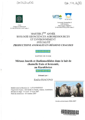 Diacono Emilie. 2007. Métaux lourds et radionucléides dans le lait de chamelle frais et fermenté, au Kazakhstan. Montpellier : UM2, 54 p. Mémoire de master 2 : Biologie géosciences agroressources et environnement. Productions animales en régions chaudes : Université Montpellier 2