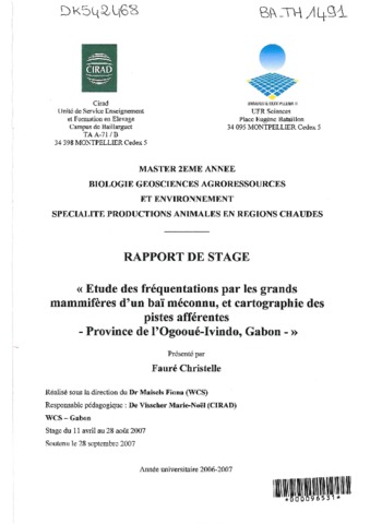 Fauré Christelle. 2007. Etude des fréquentations par les grands mammifères d'un baï méconnu, et cartographie des pistes afférentes : province de l'Ogooué-Ivindo, Gabon. Montpellier : UM2, 72 p. Mémoire de master 2 : Biologie géosciences agroressources et environnement. Productions animales en régions chaudes : Université Montpellier 2