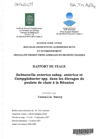 Henry Isabelle. 2007. Salmonella enterica subsp. enterica et Campylobacter spp. dans les élevages de poulets de chair à la Réunion. Montpellier : UM2, 57 p. Mémoire de master 2 : Biologie géosciences agroressources et environnement. Productions animales en régions chaudes : Université Montpellier 2