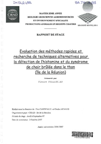 Pellissier Pierre. 2007. Evaluation des méthodes rapides et recherche de techniques alternatives pour la détection de l'histamine et du syndrome de chair brûlée dans le thon (île de la Réunion). Montpellier : UM2, 47 p. Mémoire de master 2 : Biologie géosciences agroressources et environnement. Productions animales en régions chaudes : Université Montpellier 2