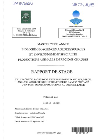 Serin Soizic. 2007. L'élevage d'alpagas dans le département d'Ancash, Pérou. Analyse zootechnique et pré-étude de la mise en place d'un suivi zootechnique grâce au logiciel laser. Montpellier : UM2, 50 p. Mémoire de master 2 : Biologie géosciences agroressources et environnement. Productions animales en régions chaudes : Université Montpellier 2