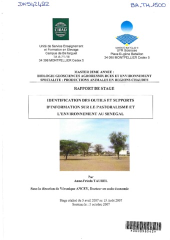 Taurel Anne-Frieda. 2007. Identification des outils et supports d'information sur le pastoralisme et l'environnement au Sénégal. Montpellier : UM2, 77 p. Mémoire de master 2 : Biologie géosciences agroressources et environnement. Productions animales en régions chaudes : Université Montpellier 2
