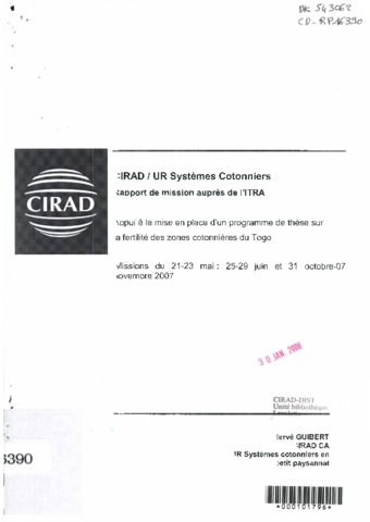 Guibert Hervé. 2007. Appui à la mise en place d'un programme de thèse sur la fertilité des zones cotonnières du Togo : rapport de mission auprès de l'ITRA du 21 au 23 mai, du 25 au 29 juin et du 31 octobre 2007. Montpellier : CIRAD-CA, 42 p.