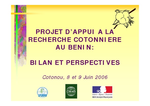 In : Projet d'appui à la Recherche cotonnière au Bénin : bilan et perspectives, Cotonou, Bénin, 8 et 9 juin 2006