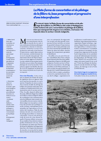 Résumé : En juillet 2005, la Plate-forme de concertation et de pilotage de la filière riz (PCPRiz) a été créée à Madagascar. Cette instance de suivi, concertation et pilotage de la filière, bien que manquant de moyens à sa création, s'est assez vite imposée dans le secteur rizicole malgache.