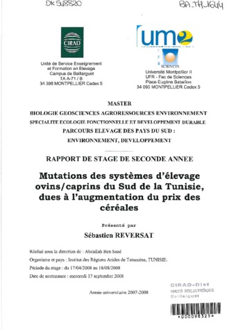 Reversat Sébastien. 2008. Mutations des systèmes d'élevage ovins caprins du sud de la Tunisie, dues à l'augmentation du prix des céréales. Montpellier : UM2, 63 p. Mémoire de master 2 : Biologie géosciences agroressources et environnement. Parcours élevage dans les pays du sud environnement et développement : Université Montpellier 2