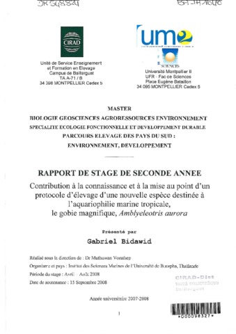 Bidawid Gabriel. 2008. Contribution à la connaissance et à la mise au point d'un protocole d'élevage d'une nouvelle espèces destinée à l'aquariophilie marine tropicale, la gobie magnifique, Amblyeleotris aurora. Montpellier : UM2, 45 p. Mémoire de master 2 : Biologie géosciences agroressources et environnement. Parcours élevage dans les pays du sud environnement et développement : Université Montpellier 2
