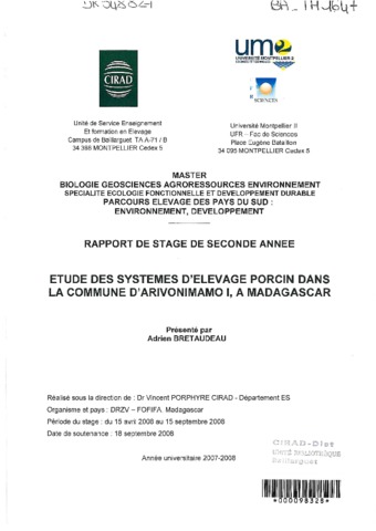 Bretaudeau Adrien. 2008. Etude des systèmes d'élevage porcin dans la commune d'Arivonimamo I, à Madagascar. Montpellier : UM2, 67 p. Mémoire de master 2 : Biologie géosciences agroressources et environnement. Parcours élevage dans les pays du sud environnement et développement : Université Montpellier 2