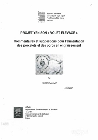 Salgado Paulo. 2007. Projet Yen Son "volet élevage" (Vietnam). Commentaires et suggestions pour l'alimentation des procelets et des porcs en engraissement. Montpellier : CIRAD-ES, 10 p.