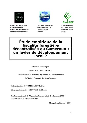 Ngoumou Mbarga Hubert. 2005. Etude empirique de la fiscalité forestière décentralisée au Cameroun : un levier de développement local ?. Montpellier : ENGREF, 94 p. Mémoire de master : Agronomie et agro-alimentaire. Foresterie rurale et tropicale : Ecole nationale du génie rural, des eaux et des forêts