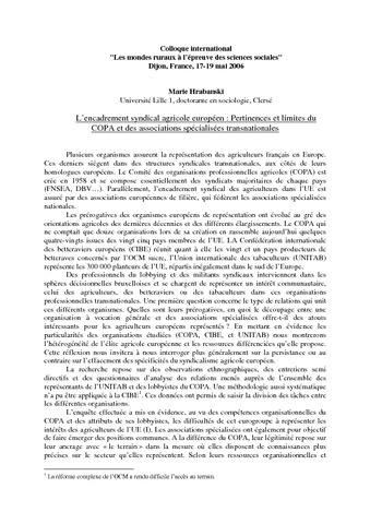 2006. L'encadrement syndical agricole européen : pertinences et limites du COPA et des associations spécialisées transnationales.