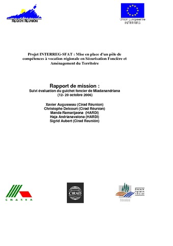 Augusseau Xavier, Delcourt Christophe, Ramarijaona Manda, Andrianavalona Haja, Aubert Sigrid. 2006. Suivi évaluation du guichet foncier de Miadanandriana : Rapport de mission (12-20 octobre 2006). Projet Interreg-SFAT, mise en place d'un pôle de compétences à vocation régionale en sécurisation foncière et aménagement du territoire. Montpellier : CIRAD, 25 p.