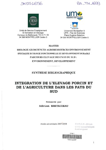 Bretaudeau Adrien. 2008. Intégration de l'élevage porcin et d'agriculture dans les pays du sud. Montpellier : UM2, 20 p. Mémoire de master 2 (Synthèse bibliographique) : Biologie géoscience agroressources et environnement. Parcours élevage dans les pays du sud environnement et développement : Université Montpellier 2