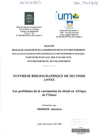 Vaudaux Sandrine. 2008. Les problèmes de la vaccination du bétail en Afrique de l'Ouest. Montpellier : UM2, 31 p. Mémoire de master 2 (Synthèse bibliographique) : Biologie géoscience agroressources et environnement. Parcours élevage dans les pays du sud environnement et développement : Université Montpellier 2