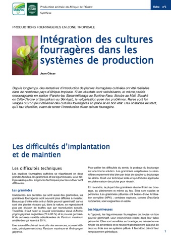 César Jean. 2001. Productions fourragères en zone tropicale. Intégration des cultures fourragères dans les systèmes de production. Bobo Dioulasso : CIRDES, 7 p. (Production animale en Afrique de l'Ouest : CIRDES, 5)