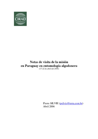 Silvie Pierre. 2006. Notas de visita de la mision en Paraguay en entomologia algodonera, 17-22 de abril del 2006. Montpellier : CIRAD, 11 p.