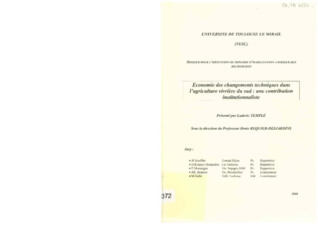 Temple Ludovic. 2010. Economie des changements techniques dans l'agriculture vivrière du sud : une contribution institutionnaliste. Toulouse : Université de Toulouse-Le Mirail, 170 p. Habilitation à diriger des recherches : Université de Toulouse-Le Mirail