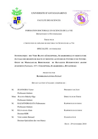 Randriamanantsoa Richard. 2010. Systématique des vers blancs Coleoptera, Scarabeoidea en riziculture pluviale des régions de haute et moyenne altitudes du centre ouest de Madagascar : bioécologie du ravageur Heteronychus arator Rugifrons (Fairmaire, 1871- Coleoptera, Scarabeoidea, Dynastidae). Antananarivo : Université d'Antananarivo, 198 p. Thèse de doctorat : Sciences de la vie. Entomologie : Université d'Antananarivo