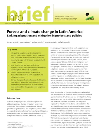 Locatelli Bruno, Evans Vanessa, Wardell Andrew, Andrade Angela, Vignola Raffaele. 2010. Forests and climate change in Latin America: Linking adaptation and mitigation in projects and policies. Jakarta : CIFOR, 6 p. (CIFOR infobrief, 31)