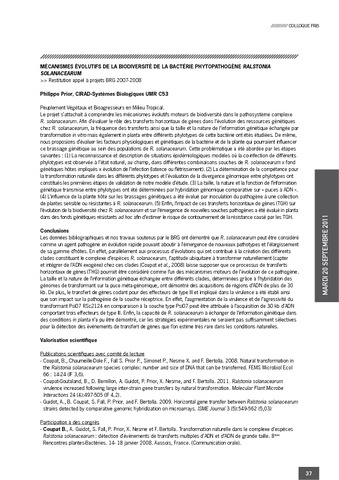 2011. Mécanismes évolutifs de la biodiversité de la bactérie phytopathogène Ralstonia solanacearum.